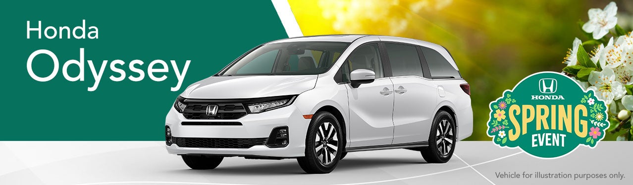 Lease Offer excludes accessories and premium paint colors. Includes $1250 Loyalty/Conquest Offer toward Cap Cost Reduction or Down Payment Assistance with lease or finance through Honda Financial Services. Closed-end lease for 2026 Honda Odyssey EX-L available through 4/30/2026 to approved lessees or purchasers by Honda Financial Services. Includes destination; excludes tax, title, license, registration, options, insurance, and $799 admin fee. Monthly payment/total due at lease signing includes $1250 Loyalty/Conquest Offer toward Cap Cost Reduction or Down Payment Assistance. Available to current owners of any 2010 or newer Honda, Chevrolet, Ford, Hyundai, Jeep, Kia, Mazda, Nissan, Subaru, Tesla, Toyota and Volkswagen vehicles. Must provide proof of ownership of eligible vehicle in the form of a current vehicle registration or proof of valid auto insurance. No trade-in required. Lessee responsible for maintenance, excessive wear/tear, and up to $0.20/mi. over 10,000 miles/year. Dealer participation may affect actual payment. Dealer sets actual prices. See dealers for details. APR Available on approved credit through Honda Financial Services in select states only. 3.99% APR for up to 48 months on select new and unregistered 2026 Honda Odyssey models through 4/30/2026, for well-qualified buyers. Excludes Hybrid models. Not all buyers will qualify. Higher financing rates apply for buyers with lower credit ratings. Actual down payment may vary. Dealer participation may affect actual payment. Dealer sets actual prices. See participating dealers for details.