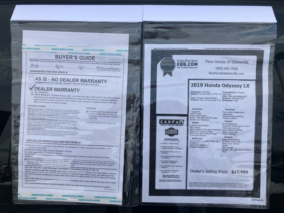 FLOW CERTIFIED! 12 MONTHS/12000 MILE WARRANTY 3 day money back guarantee and a free maintenance package on this 2019 Honda Odyssey Modern Steel Metallic LX! **